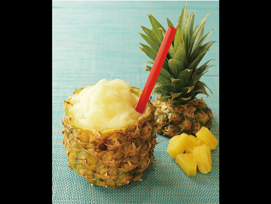 大迫力の果実丸ごとパインスムージー!今年はスイカ・バナナも。台湾飯の魯肉飯や鶏排と合わせてどうぞ!
