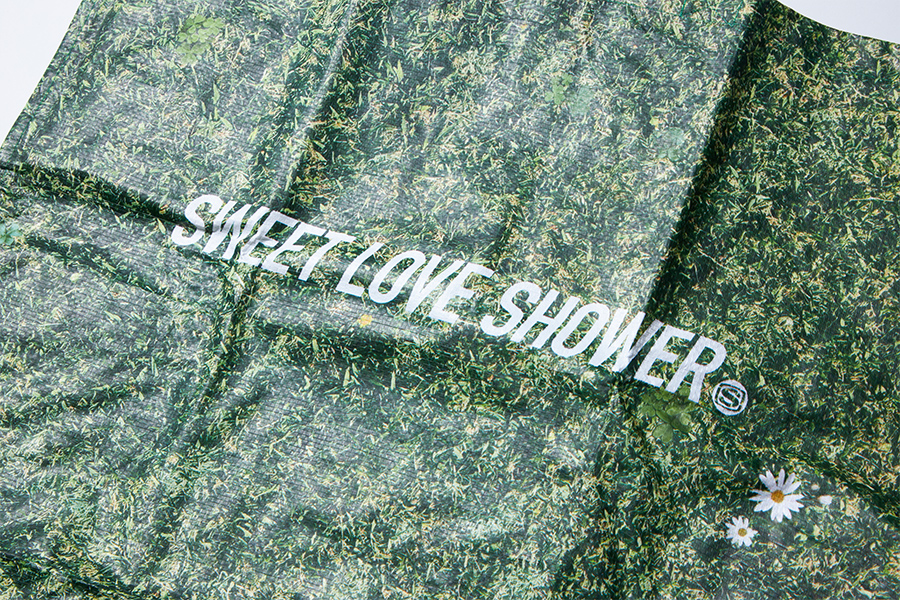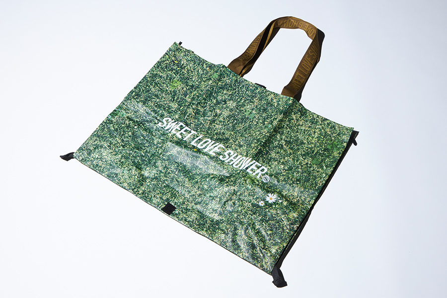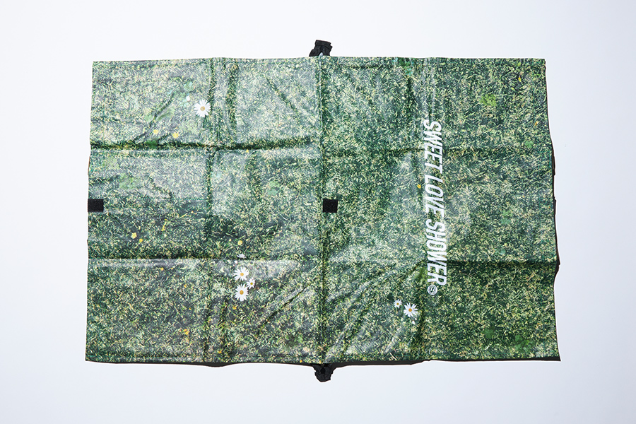 普段はカバン、必要とあれば開いてレジャーシートに大変身!柄は芝生の上に広げると自然と馴染むオリジナルの芝生カモフラージュを採用。